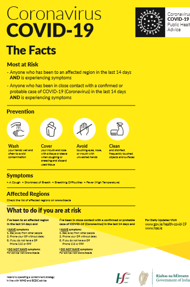 1. Follow all public health guidance provided by state authorities – the Public Health Agency in Northern Ireland (www.publichealth.hscni.net) and the Health Protection Surveillance Centre in the Republic of Ireland (www.hpsc.ie).
