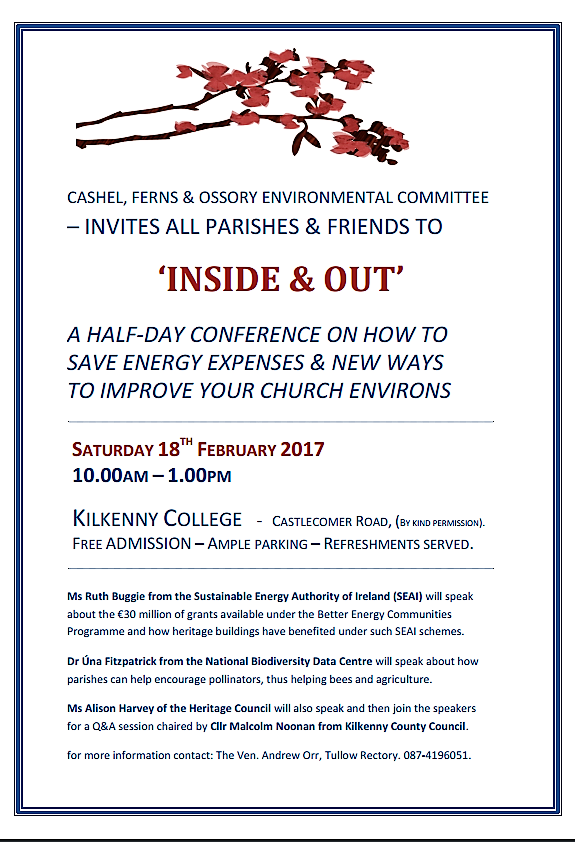 Parishioners and clergy from across the Cashel, Ferns and Ossory Diocese came in large numbers to Kilkenny College on Saturday, 18th February to learn ways of improving their church properties, inside and out. A number also teamed up with parishes which have already been grant aided to carry out work. There was good collaboration between Roman Catholic, Methodist and Church of Ireland parishioners represented at this ‘Inside & Out’ conference.